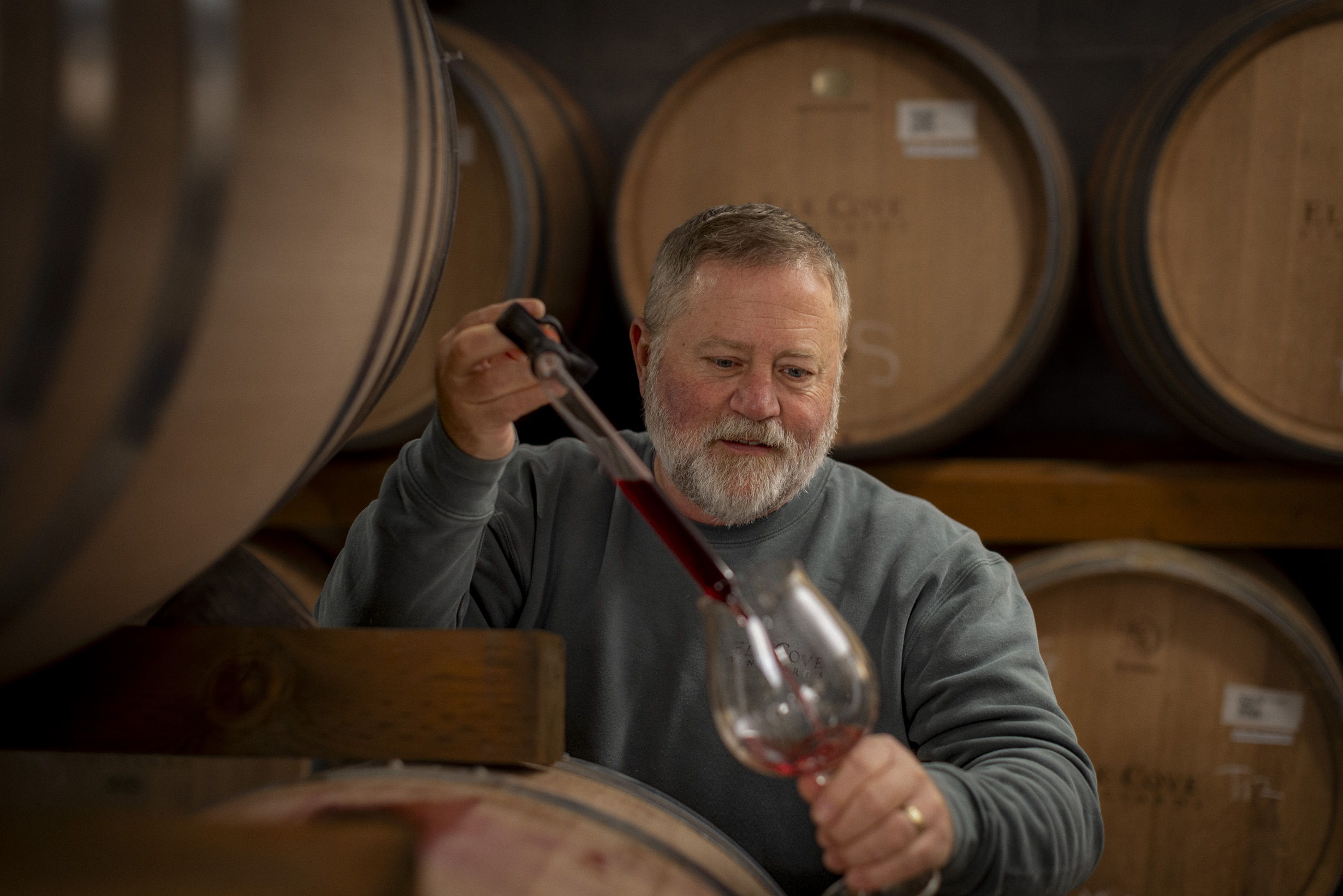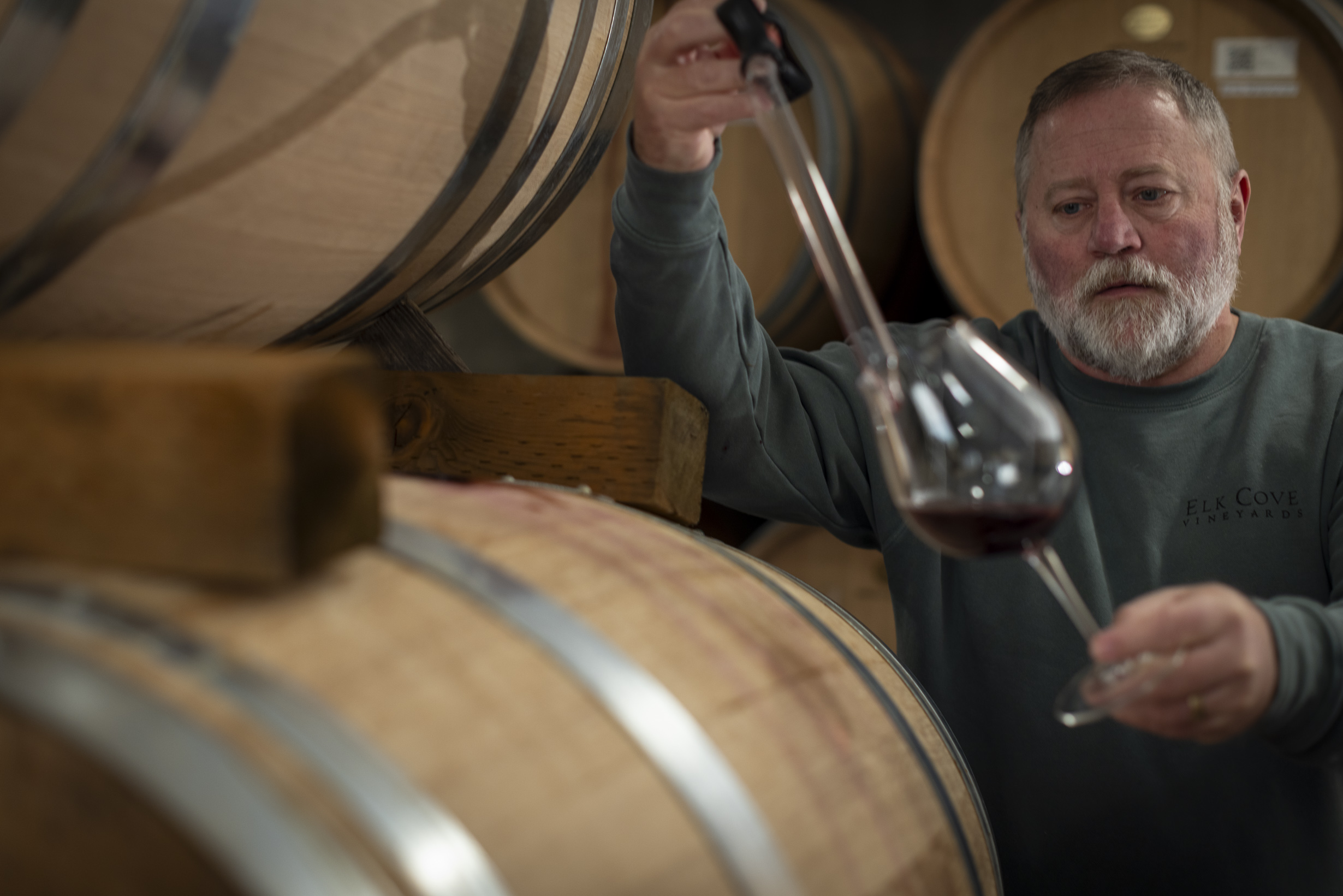 ADAM: Traditionally, it’s a slower time of year. It gives us an opportunity to taste barrels and to see what’s working. I like the idea that the Pinot noirs and these barrels behind me, they’re just kind of settling, becoming a little more clarified, and we’re starting to get a real sense for how the French oak barrel is integrating into the fruit of the wine.